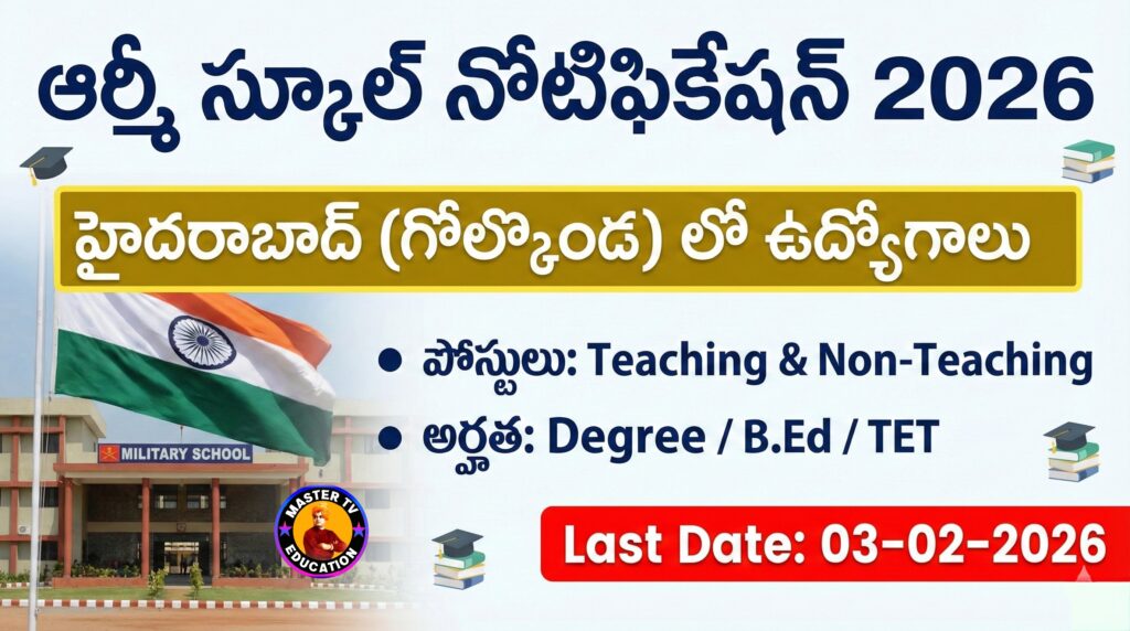 హాయ్ ఫ్రెండ్స్! తెలంగాణలో టీచర్ ఉద్యోగాల కోసం ఎదురుచూస్తున్న అభ్యర్థులకు ఇది ఒక శుభవార్త. హైదరాబాద్లోని ఆర్మీ పబ్లిక్ స్కూల్ (APS) గోల్కొండ, 2026-27 విద్యా సంవత్సరానికి గాను పలు టీచింగ్ మరియు నాన్-టీచింగ్ పోస్టుల భర్తీకి నోటిఫికేషన్ విడుదల చేసింది. అర్హత, ఆసక్తి ఉన్న అభ్యర్థులు ఫిబ్రవరి 3, 2026 లోపు దరఖాస్తు చేసుకోవాల్సి ఉంటుంది. ఈ నోటిఫికేషన్ కు సంబంధించిన అర్హతలు, వయోపరిమితి మరియు దరఖాస్తు విధానం గురించి “Master TV Education” ద్వారా పూర్తి వివరాలు తెలుసుకుందాం.