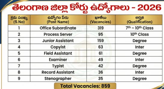 తెలంగాణ రాష్ట్రంలోని నిరుద్యోగులకు హైకోర్టు అదిరిపోయే శుభవార్త చెప్పింది. రాష్ట్రంలోని వివిధ జిల్లా కోర్టుల్లో ఖాళీగా ఉన్న ఉద్యోగాల భర్తీకి సంబంధించి ఏకంగా 9 నోటిఫికేషన్లను విడుదల చేసింది. కేవలం 10వ తరగతి మొదలుకొని డిగ్రీ అర్హత వరకు వేర్వేరు ఉద్యోగాలు ఇందులో ఉన్నాయి.